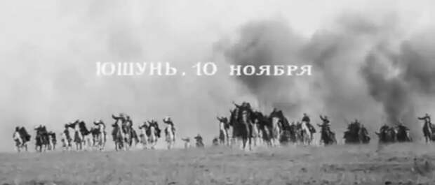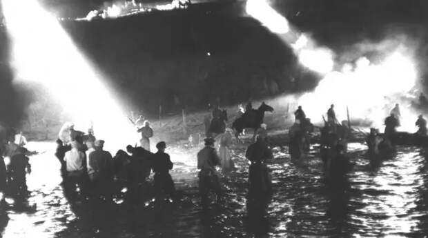 А это кадр фильма «Бег» (1970 г.) – придуманный эпизод крымской эвакуации, в котором белые якобы стреляют по красным кавалеристам из установленных на катерах пулеметов: