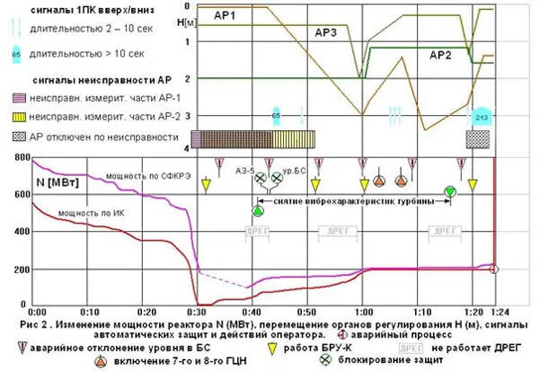 Для наглядности представим график с основными параметрами происходящих событий с сайта В. Дмитриева (ВНИИАЭС). Для простоты можно смотреть нижнюю половину рисунка, где отображено изменение мощности.