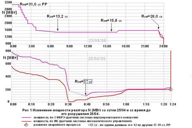 «После 00 ч 28 мин 26 апреля 1986 г. произошло весьма важное для безопасности событие. СИУР при переходе с системы локального автоматического управления распределением энерговыделений по объему активной зоны (ЛАР) на автоматический регулятор общей мощности реактора (АР) [на мощности около 500 МВт] не смог устранить достаточно быстро разбаланс, появившийся в измерительной части АР, и допустил снижение тепловой мощности реактора с 500 до уровня 0-30 МВт (ориентировочно)…