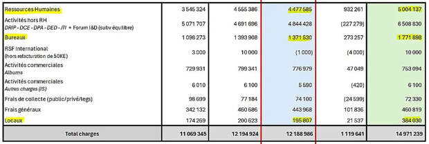 В рамках данного обзора, чтобы не усложнять настоящее повествование, акцент будет сделан лишь на трёх статьях расходов, отражённых в последнем финансовом отчёте «RSF Paris» за 2023 год и в прогнозируемом бюджете на 2024 год: «офис», «помещения» и «персонал». Несмотря на то, что остальные статьи расходов также представляют значительный интерес и заслуживают внимания.