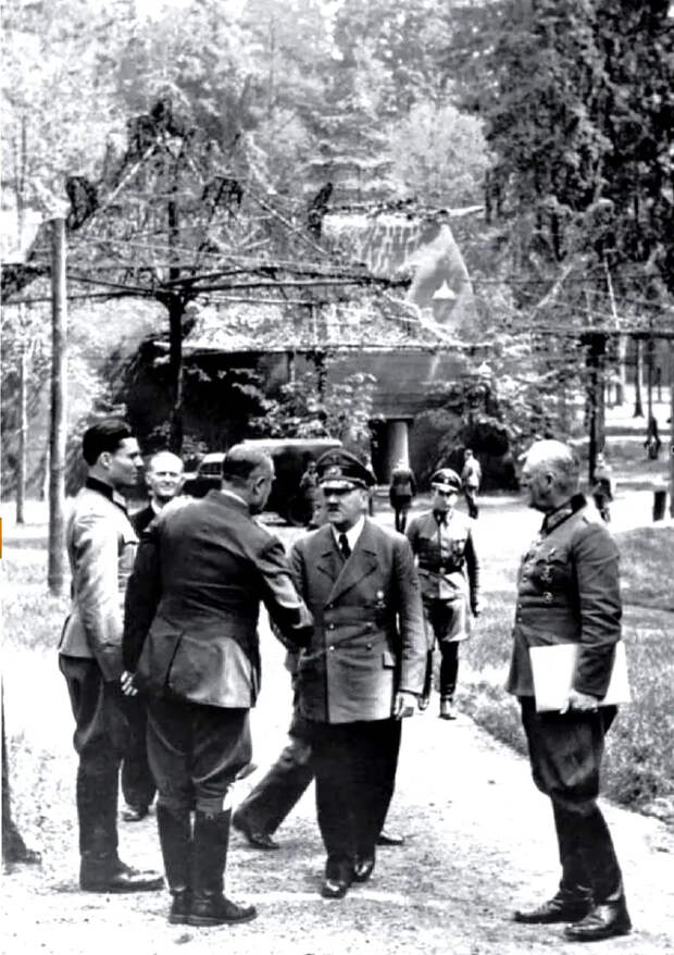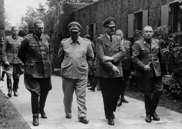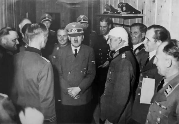 Начальник штаба Верховного главнокомандования вооруженными силами Германии фельдмаршал Вильгельм Кейтель, рейхсминистр Имперского министерства авиации Герман Геринг, Адольф Гитлер и начальник Партийной канцелярии НСДАП, ближайший соратник Гитлера Мартин Борман. Фотография сделана после самого известного покушения на Гитлера – тот потирает поврежденную при взрыве руку.
