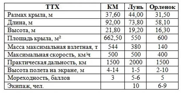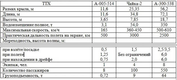 Основные ТТХ экранопланов СССР (разработка ЦКБ по СПК)