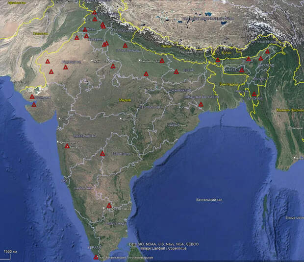 Схема расположения на территории Индии радиолокационных постов по состоянию на 2020 год