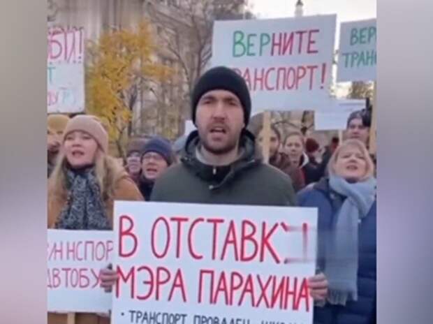 В кадре — толпа возмущённых горожан с плакатами, осуждающими уничтожение зелёных насаждений, кризис в образовании и транспортную недоступность. Всё выглядело как классический уличный протест.